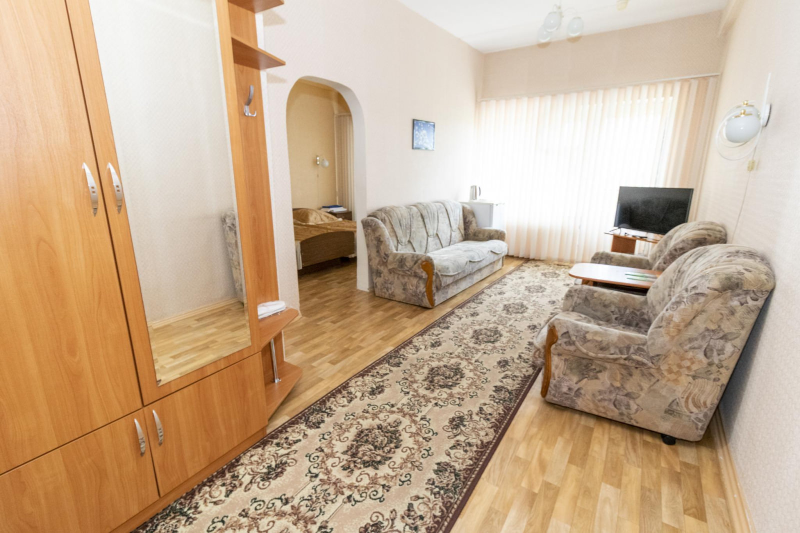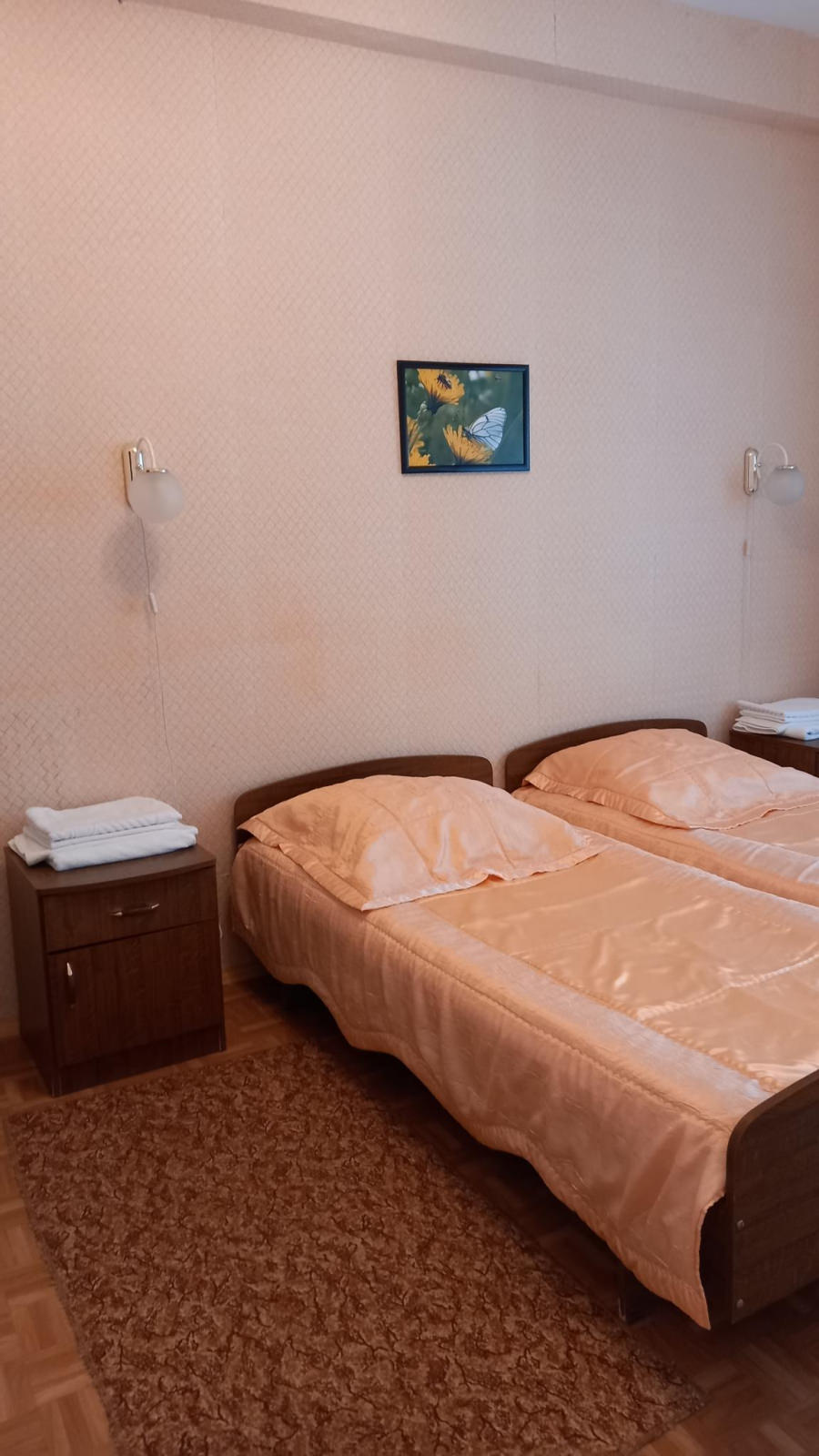 Двухкомнатный номер: 2 односпальные кровати, санузел с душевой кабиной, фен, прикроватные тумбы, комод, зеркало, уголок отдыха, стол журнальный, прихожая, ТВ, холодильник, чайник, телефон, зона WiFi, одноразовые гигиенические принадлежности